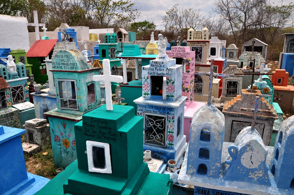 Hoctùn est un petit village du Yucatán proche de la ville de Mérida. Les tombes de son cimetière sont inspirées de la mythologie maya, de la religion catholique, de la culture coloniale espagnole et des traditions locales. Les monuments funéraires sont couronnés de croix mais aussi de pyramides maya, de reproductions d’églises, de maisons ou de symboles divers.