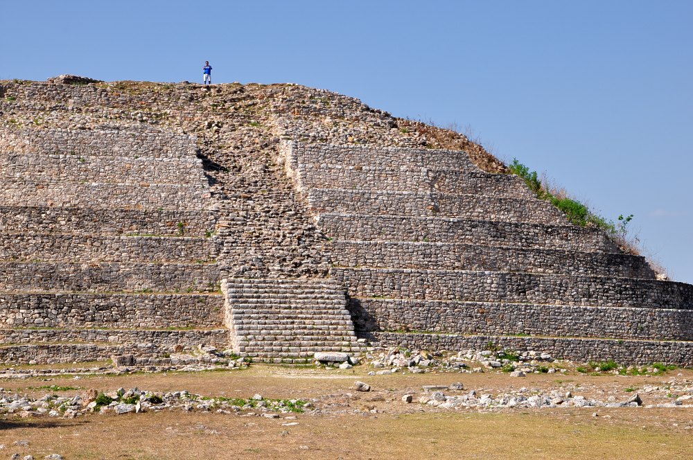 La pyramide maya de Kinich Kak Mo était dédiée au Dieu Soleil. Beaucoup de pierres en ont été retirées mais elle occupe toujours un volume d’au moins 700 000 mètres cubes sur une base de 0,5 km