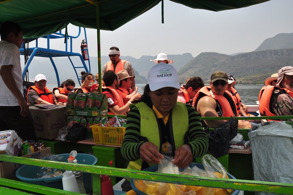 Au bout du parcours. La lancha ralentit. Une peu de sérénité ? Non, un peu de commerce. Les lanchas s'agglutinent autour d'une barque restaurant. Les tacos sont servis dans des sachets en plastique.