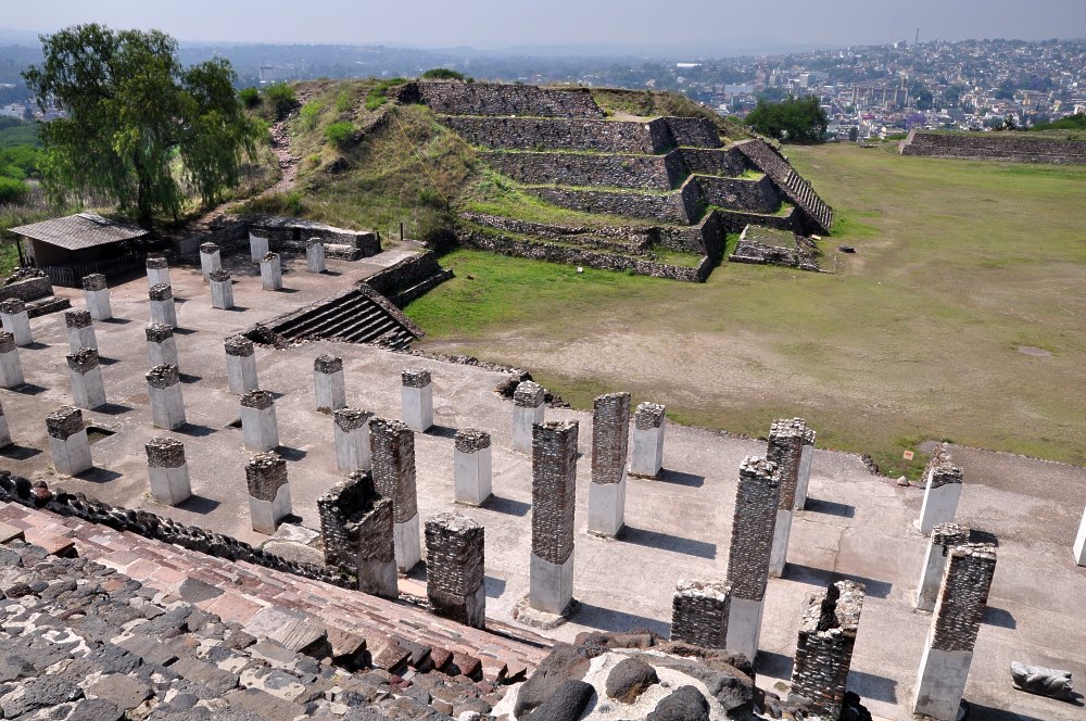 Vue de ce qui reste du Palais de Quetzalcoatl et de la Pyramide C, du haut du Temple de Tlahuizcalpantecuhtli.
