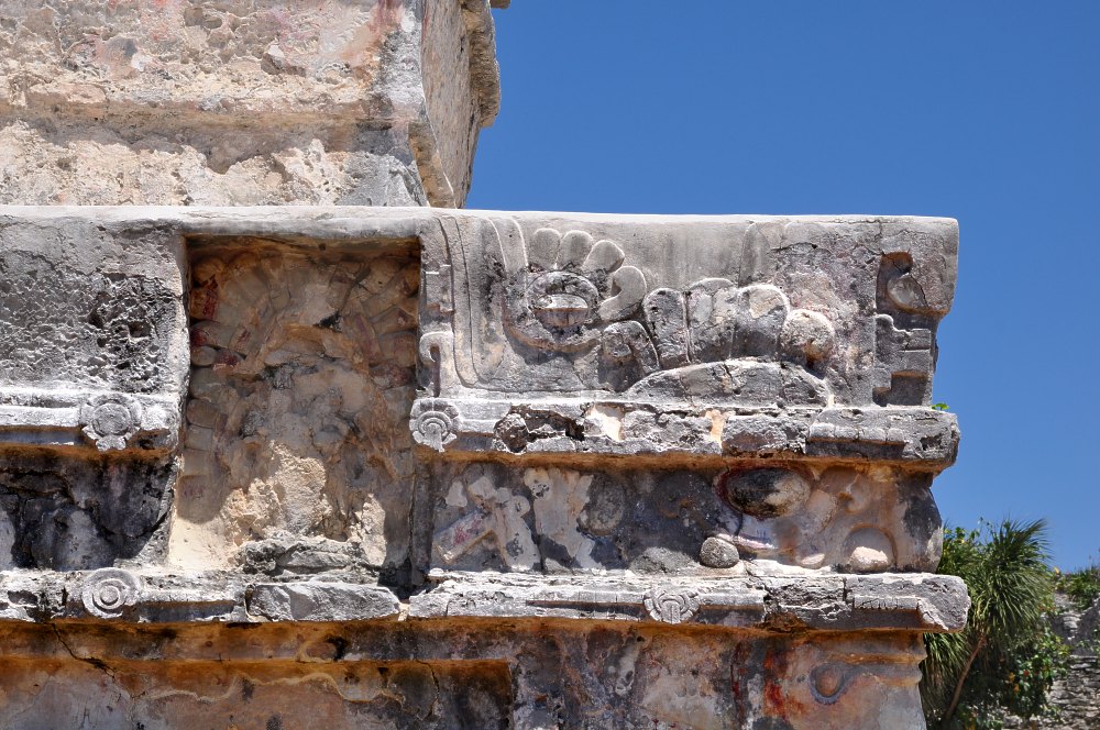 Dans chacun des angles du temple, on peut voir un énorme mascaron de stuc aux couleurs maintenant délavées. Il pourrait s’agir de la représentation du dieu Itzamna, le créateur de toutes choses. Il peut aussi s’agir de Kukulkán, le dieu serpent à plumes des Mayas.