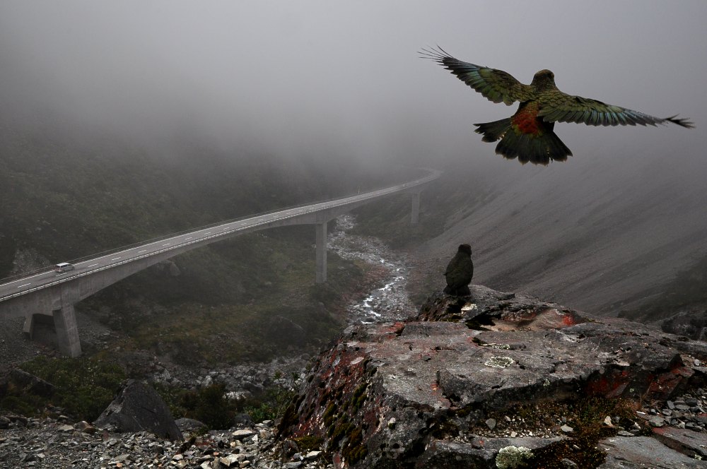 Vols de kea (le mot est un pluriel) au dessus du Viaduc Otira. Cet ouvrage d’art destiné à régler les problèmes récurants d’avalanches et de glissements de terrain a été terminé en 1999.