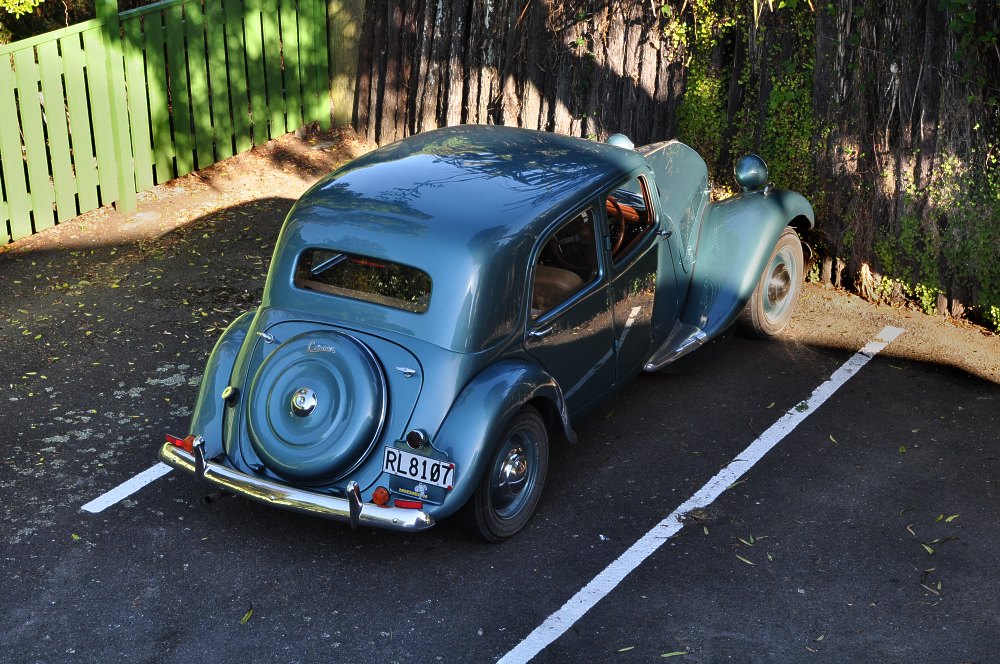 Traction Citroën sur le parking d’un motel. Les Néo-zélandais sont les champions du monde pour la possession de vieilles voitures. Elles sont utilisées dans la vie quotidienne en dépit de leur âge et du respect qu’on leur doit. La majorité d’entre elles sont de vieilles voitures américaines mais pas seulement. Certaines ont été restaurées mais la plupart sont restées en l’état.