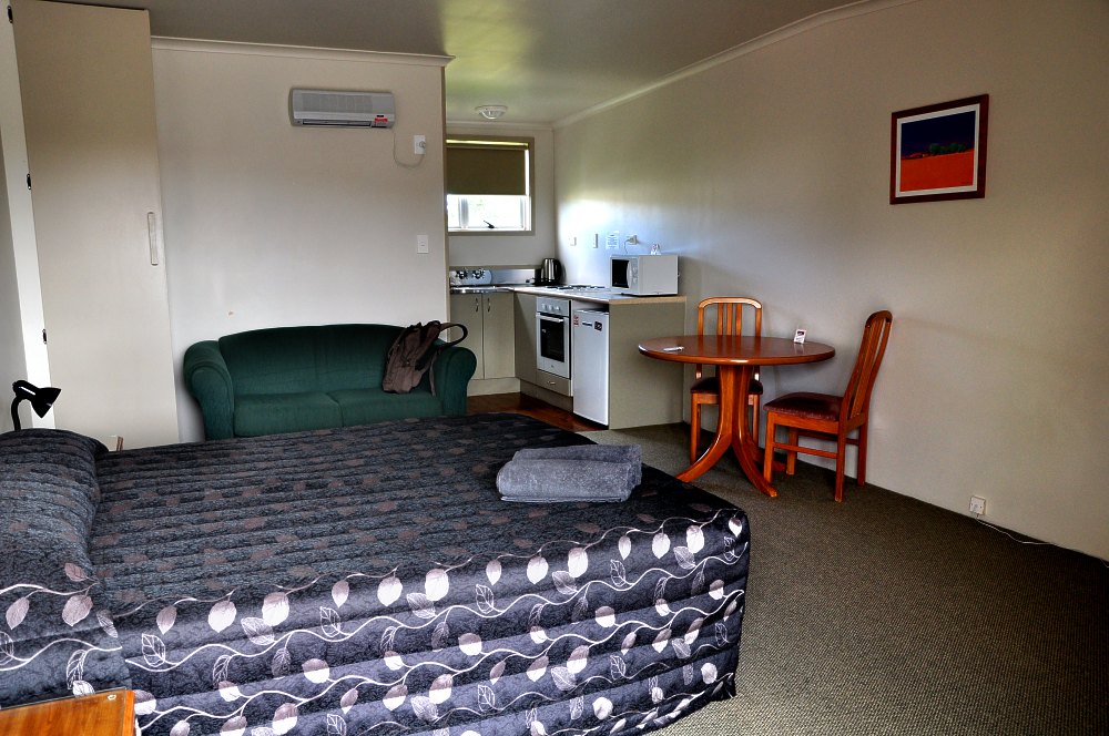 Equipement de base : Frigidaire, four, micro-onde, toaster, coin repas, télé, bien sûr. Plus, invisible mais toujours là, le matelas chauffant dans le lit.