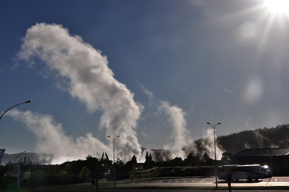 La ville de Rotorua est véritablement assise sur une chaudière géothermique et la vapeur dégagée est le plus possible captée pour le chauffage urbain. Il s’en échappe toutefois suffisamment pour rendre les petits matins spectaculaires.