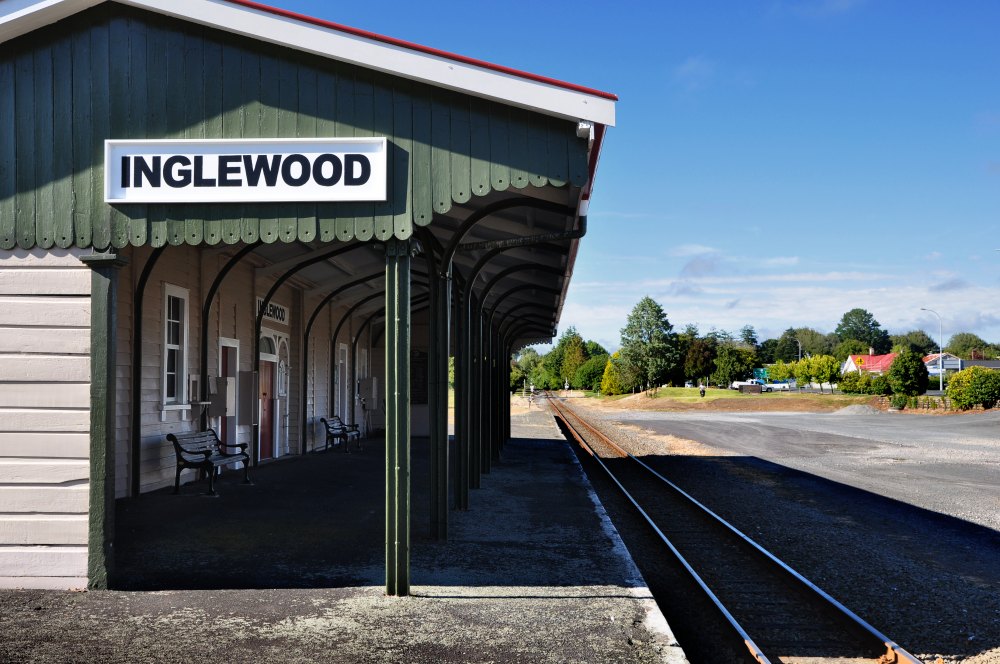 Inglewood se trouve à 16 kilomètres de New Plymouth, à proximité immédiate du volcan Taranaki, également connu sous le nom de Mount Egmont. La gare, en activité comme toutes les gares aussi anciennes soient-elles en Nouvelle-Zélande, est néanmoins classée monument historique.