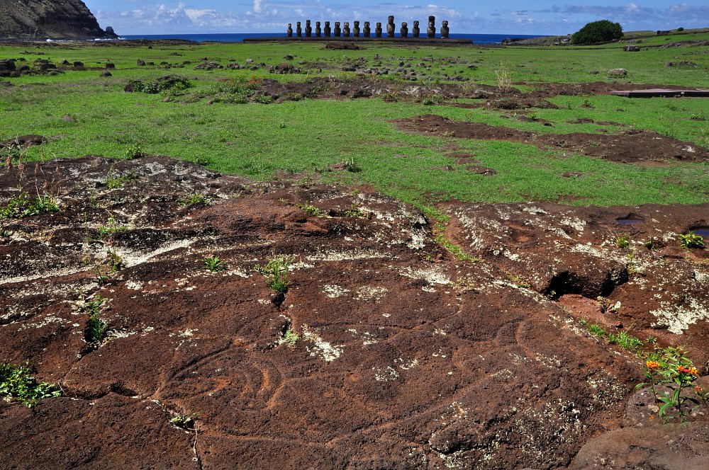 Enfrente del ahu, hay un importante sitio de petroglifos con figuras de atún, tortuga, el dios Make Make y el Hombre Pájaro.
