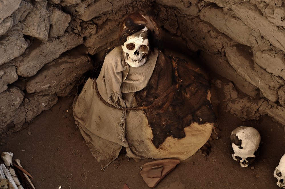 Remarquez le cordon qui semble entourer la cape de la momie. En fait, il s’agit de ses cheveux tressés en natte.