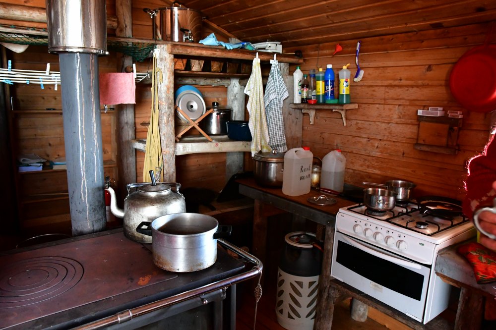 La pièce principale sert de salon, cuisine et chambre. Même en été, le poêle est allumé. Il permet d'avoir de l'eau chaude tandis que la gazinière sert à la cuisson des aliments.