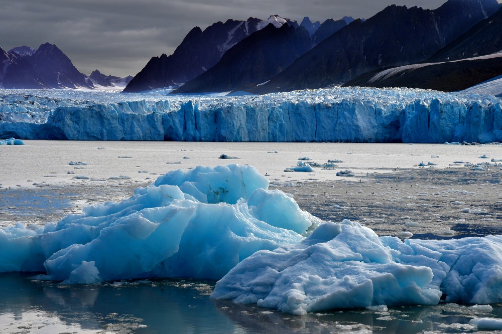 Les sommets acérés des montagnes du Liefdejorden culminent à 1000m d'altitude et dominent le front de glace de plus de 5km de large qui se déverse dans le fjord.
