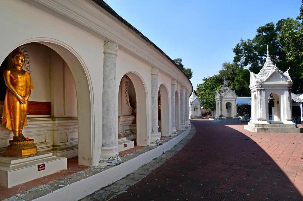 La galerie extérieure du cloître abrite des statues récentes de bouddha.