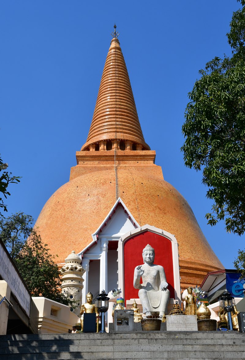 Le Chedi Phra Pathom, le plus haut du monde bouddhique avec ses 127m, est entièrement recouvert de tuiles dorées. Il date de la fin du XIX siècle.