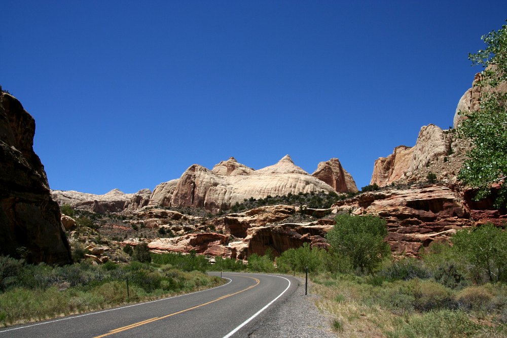 Des dômes massifs, ciselés par l'érosion dominent la route qui le traverse.