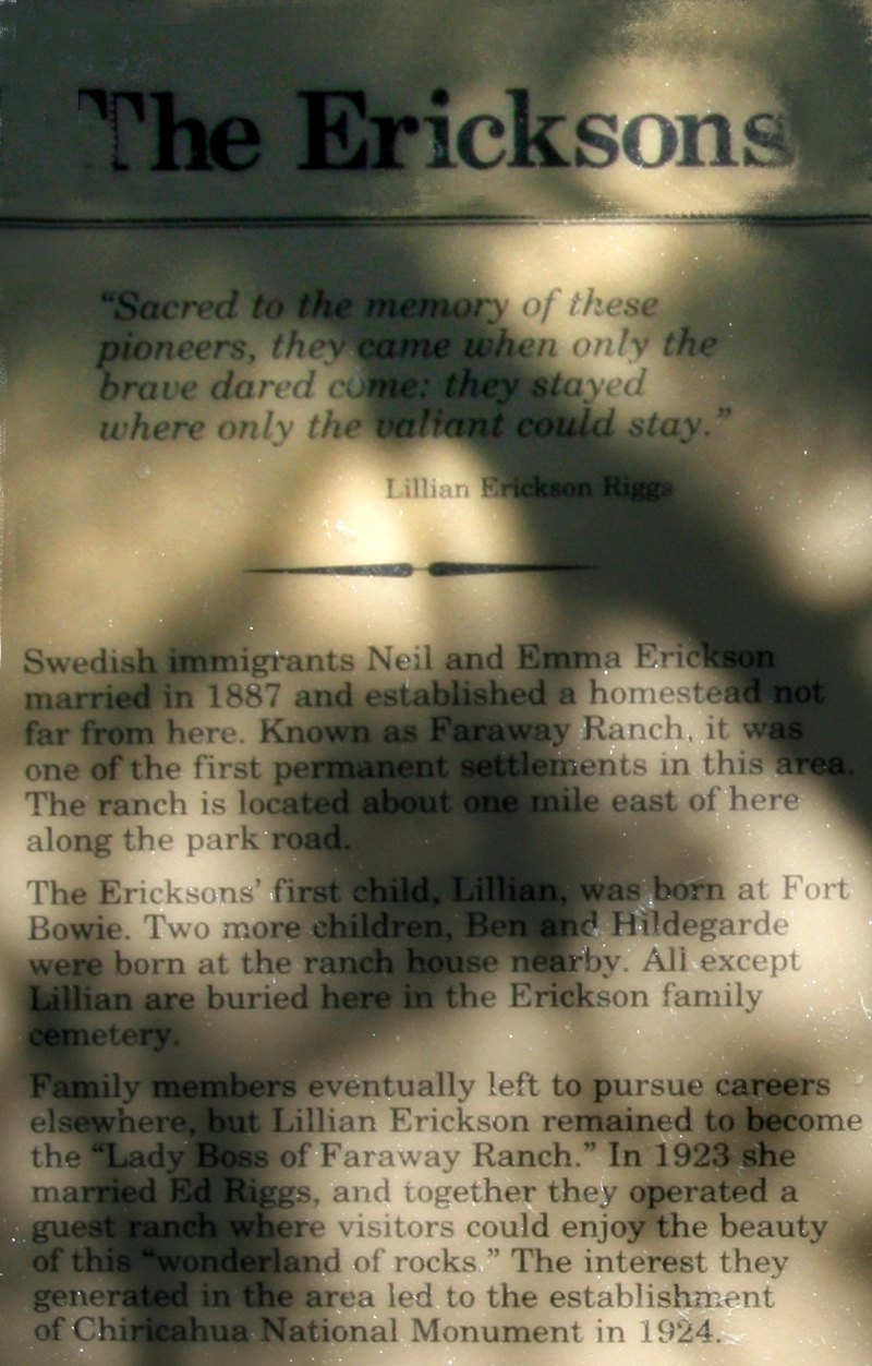 Lillian, la fille aînée a vécu dans la ferme transformée en "gite" pour touristes et c'est grâce à elle que l'endroit est devenu le Chiricahua National Monument en 1924.