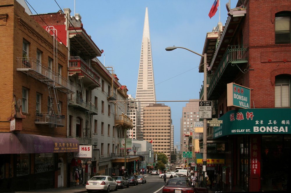 The Transamerica Pyramid seen from the corner of Waverly and Clay Street.