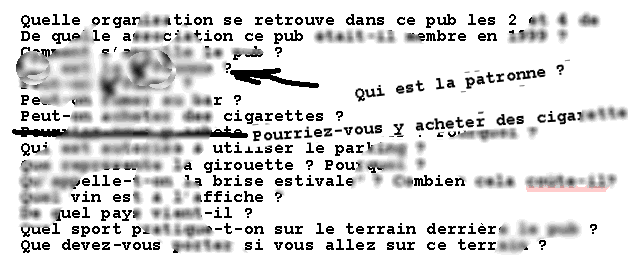 (Ce morceau de papier vient d’une des poubelles du jardin du pub. D’après la patronne il a été laissé par un professeur français qui préparait un voyage scolaire. Vous pouvez y jeter un coup d’œil mais la pluie en a effacé une grande partie.)