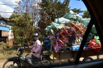 Nous allons vers le nord. Le réseau routier n'est pas dense mais les voies principales sont en bon état. Les pistes de terre rouge qu'on doit aussi emprunter le sont également mais parce que nous sommes à la saison sèche. Elles seraient impraticables pendant la mousson. Les bornes kilométriques se succèdent, parfois tous les 50m. La raison : il y a une borne par ville à venir avec la distance qui vous en sépare.