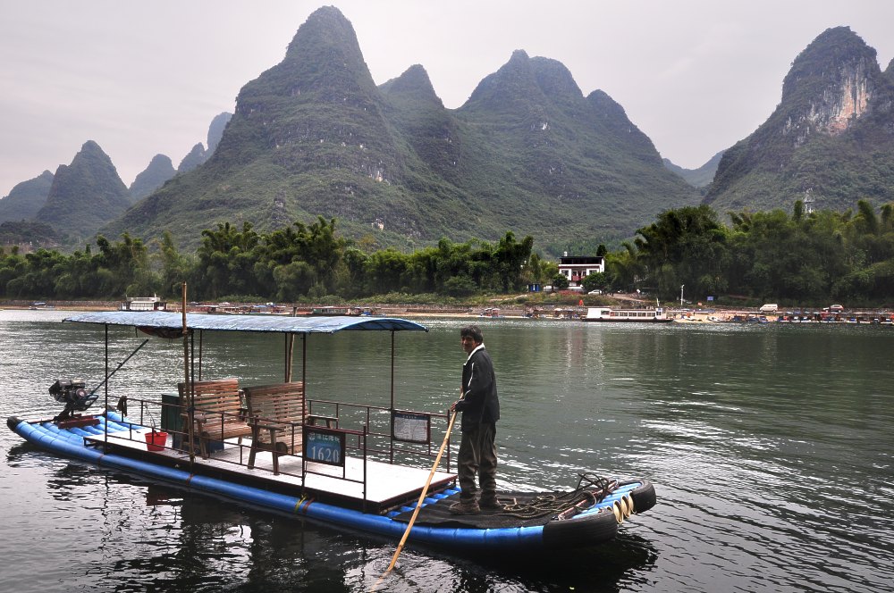 Un radeau sur la rivière Li. Celui que nous avons emprunté était nettement plus basique. Juste la place pour deux, les vélos et le patron.
