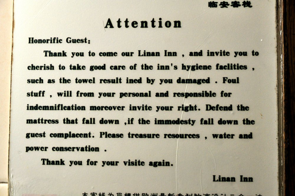 Invité honorifique. Merci de venir notre auberge, et invitez-vous pour vous chérir à bien s’occuper des "faitcilités" de l’hygiène de l’auberge comme le résultat de la serviette de toilette par vous endommagée. Dégueulasse, héritage de votre personnel et responsable pour votre "indemnification" encore plus invitez votre droit. Défendez le matelas qui tombe, si la non modestie tombe l’invité "satasfait". S’il vous plaît, respectez les ressources, eau et préservation de l’électricité. |