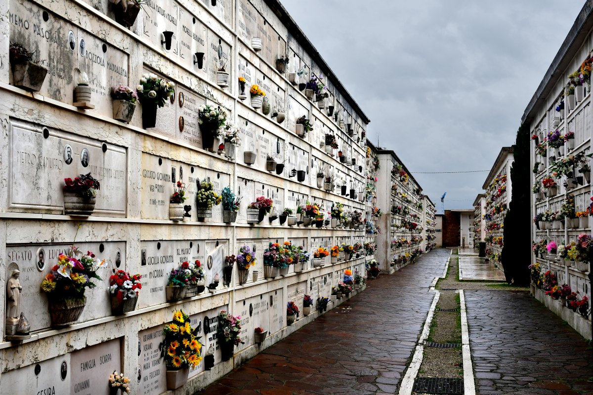 Une grande partie du cimetière est occupée par des colombariums dont les niches sont colorées de bouquets de fleurs en plastique