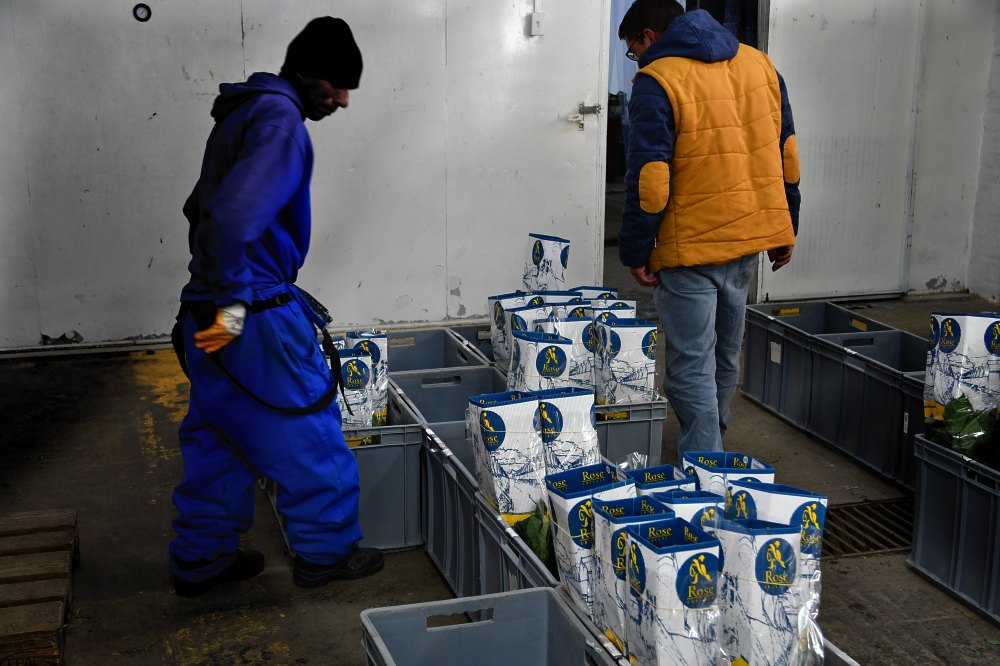 Les bouquets sont installés dans des bacs qui contiennent un peu d'eau et orientés vers une chambre froide où ils vont attendre d'être envoyés par avion vers l'Amérique du nord et l'Europe.