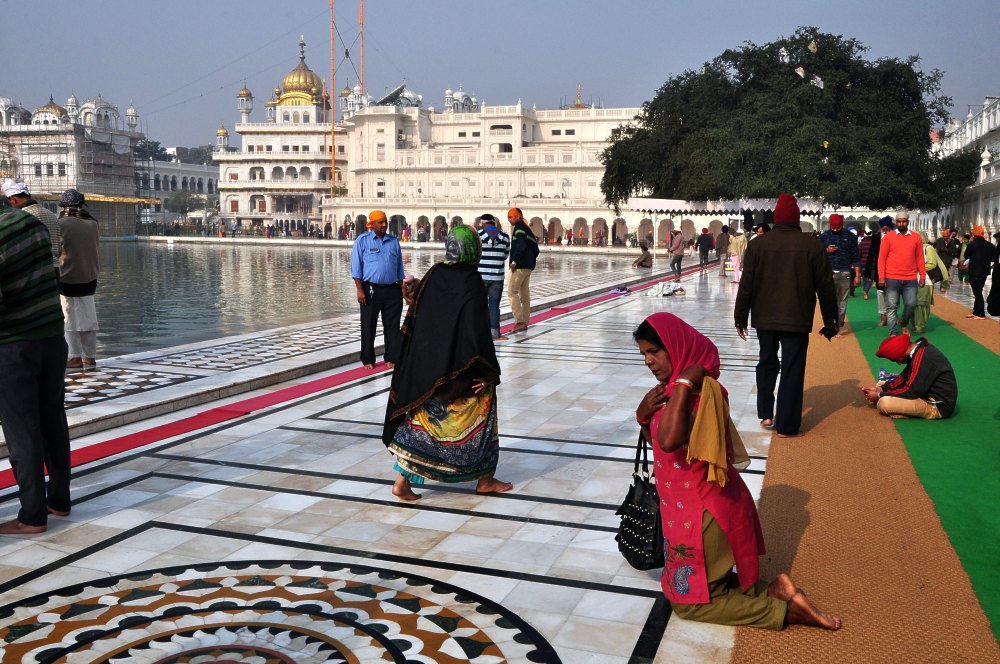 Sur le quai la foule déambule. Certains prient, d’autres se reposent… Dans le fond on aperçoit l’Akal Takht, siège de la secte.