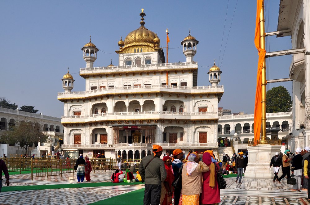 Les niveaux supérieurs de l’Akal Takht ont été construits par Ranjit Singh. Sur la droite on aperçoit (en orange) les Nishan Sahibs, hampes des gourous.