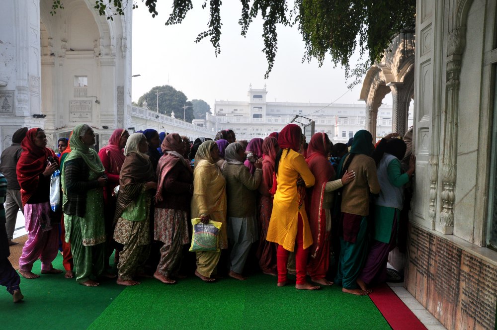 La foule des femmes se presse pour pouvoir se baigner dans les eaux sacrées du bassin d’Ambroisie, l’Amrit Sarovar, qui a donné son nom à la ville.
