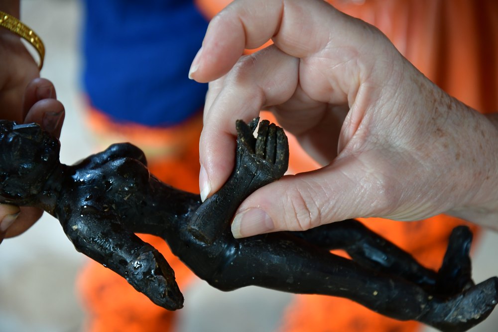 Modelage d'une figurine en cire. Les artisans s'inspirent de modèles ancestraux. La figurine est ensuite enveloppée dans une couche d'argile qui sèche au soleil avant d'être cuite.