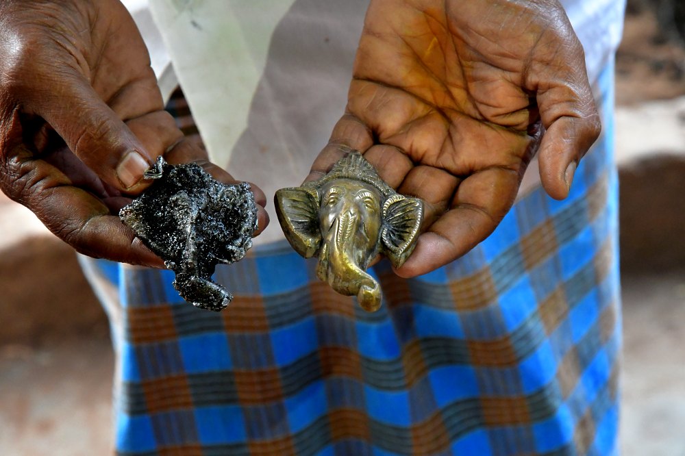 A gauche, l'objet brut. A droite, le même une fois limé, poli et affiné. Quelques heures suffisent pour un petit objet comme celui-ci. Pour un grand moulage, il faut parfois plusieurs semaines.