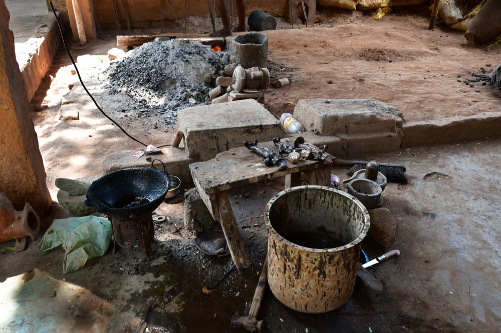 Vue générale de l'atelier. A gauche sur un petit réchaud, la bassine où se fait le mélange de résine et de cire d'abeille.