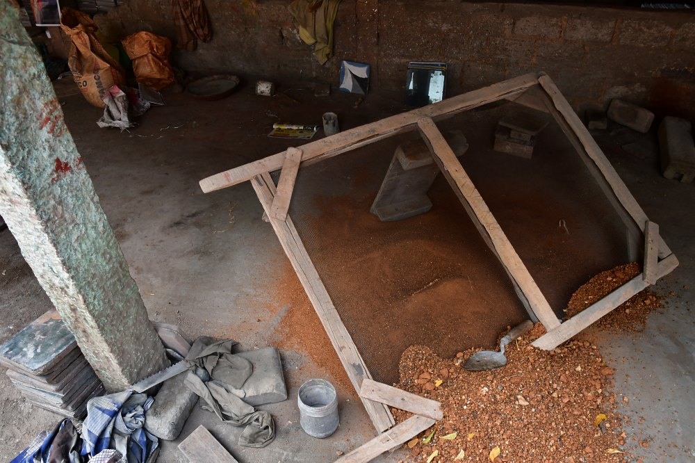 Nous sommes à Aathangudi, au Chettinad, dans l'état du Tamil Nadu. Ce village est célèbre pour ses carreaux de ciment colorés. Sur la photo : tamisage de l'argile locale utilisée pour la fabrication des dalles.