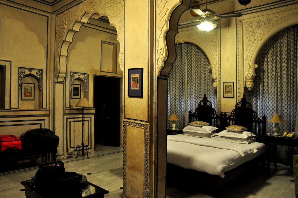 Le Pal Haveli à Jodhpur est un des hôtels qui nous a le plus marqués. Il est situé en plein centre ville. C'est une maison de marchands qui a été transformée par la famille pour recevoir des visiteurs. Tout est imprégné de l'histoire du bâtiment. Notre chambre était celle de la grand-mère de l'actuel propriétaire qui l'a faite aménager afin d'en faire un endroit unique et inimitable. Elle est restée en l'état, ainsi que le reste de l'hôtel d'ailleurs et c'est impressionnant.