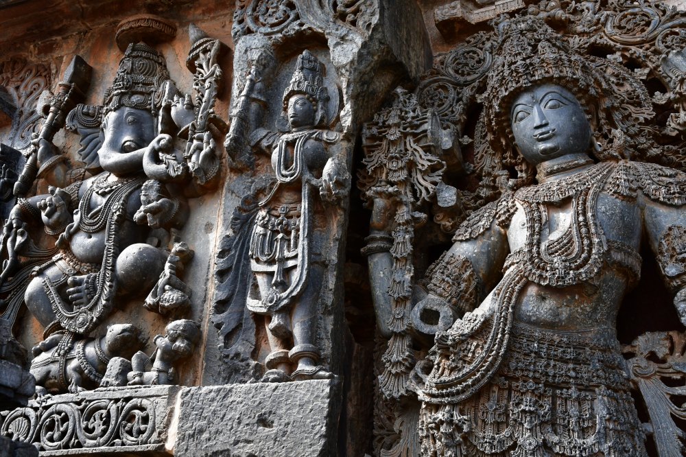 A côté du gardien à la mine féroce, Ganesh danse sur la souris, son véhicule céleste.