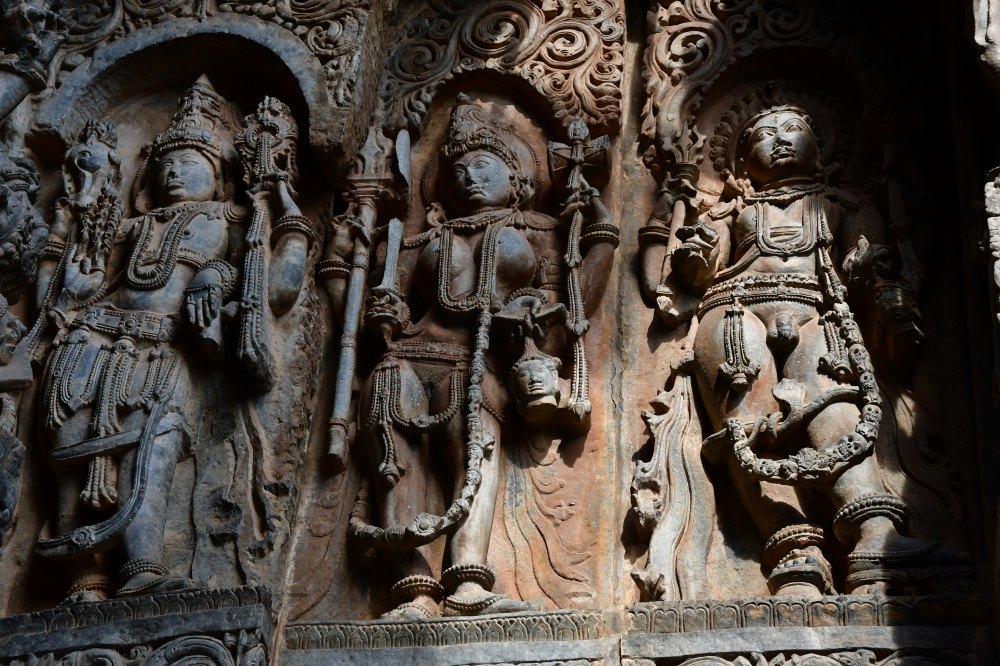 Au milieu, Durga tient la tête d'un démon qu'elle vient de tuer. Le sang coule à flots.