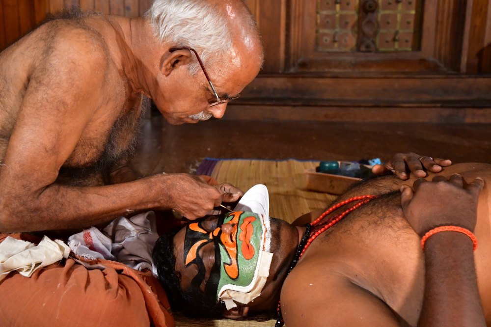 Trois séries de bandelettes de plus en plus grandes sont installées de chaque côté du visage.