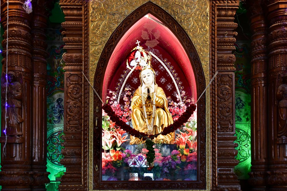 L'intérieur de l'église est dépouillé mais les statues sont richement habillées à la mode indienne.