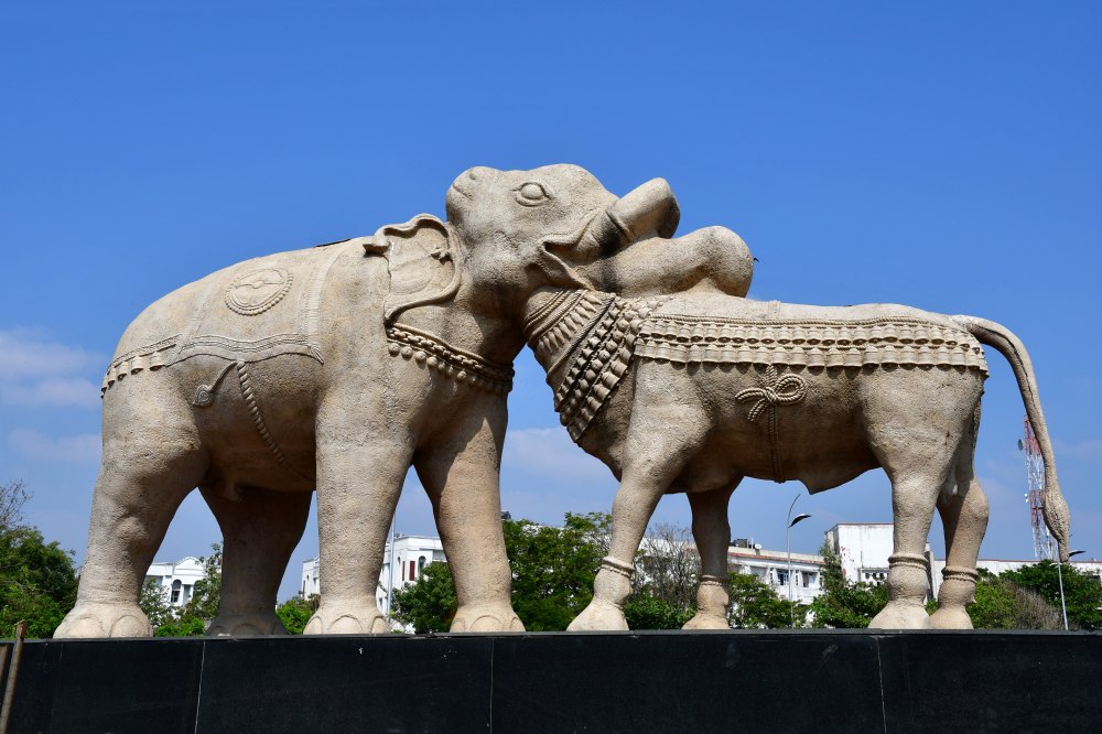 Sculpture moderne d'une représentation classique dans les temples hindous. Selon la façon dont on la regarde on voit la tête de l'éléphant ou la tête de la vache.
