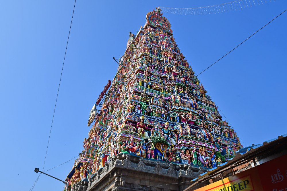 Les gopuram, hautes tours d'entrée, sont le principal signe caractéristique des temples du Tamil Nadu.