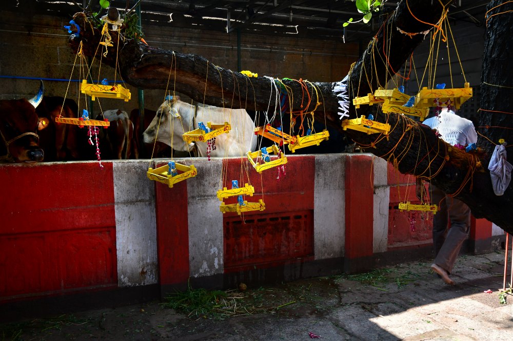 "Berceaux". Les femmes viennent prier Shiva de leur accorder un enfant. Derrière, on aperçoit les vaches offertes au temple par des fidèles. Leur lait sert aux offrandes et à la nourriture des pèlerins.