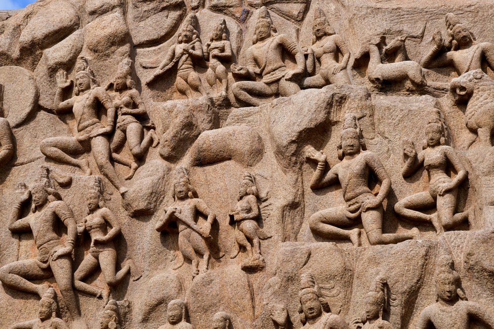 Les deux Kinnara, mi humains mi oiseaux, jouent de la musique.