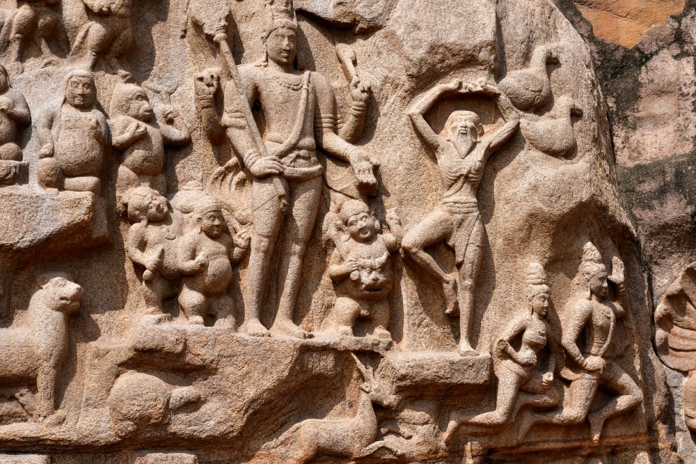 Shiva debout à côté de Bhagiratha. Il est accompagné de ganas, qui représentent les gens qui ont passé leur vie à lui rendre hommage et ont le droit comme récompense de passer le reste des temps à ses côtés. C'est grâce à son ascèse que Bhagiratha a réussi à faire descendre Ganga sur terre pour apporter bonheur et prospérité au peuple.