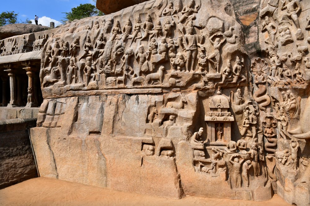 Plus de cent personnages, dieux, humains et animaux assistent à l'événement mythique. Lions sauvages, couples de divinités, singes s'approchent de la rivière.