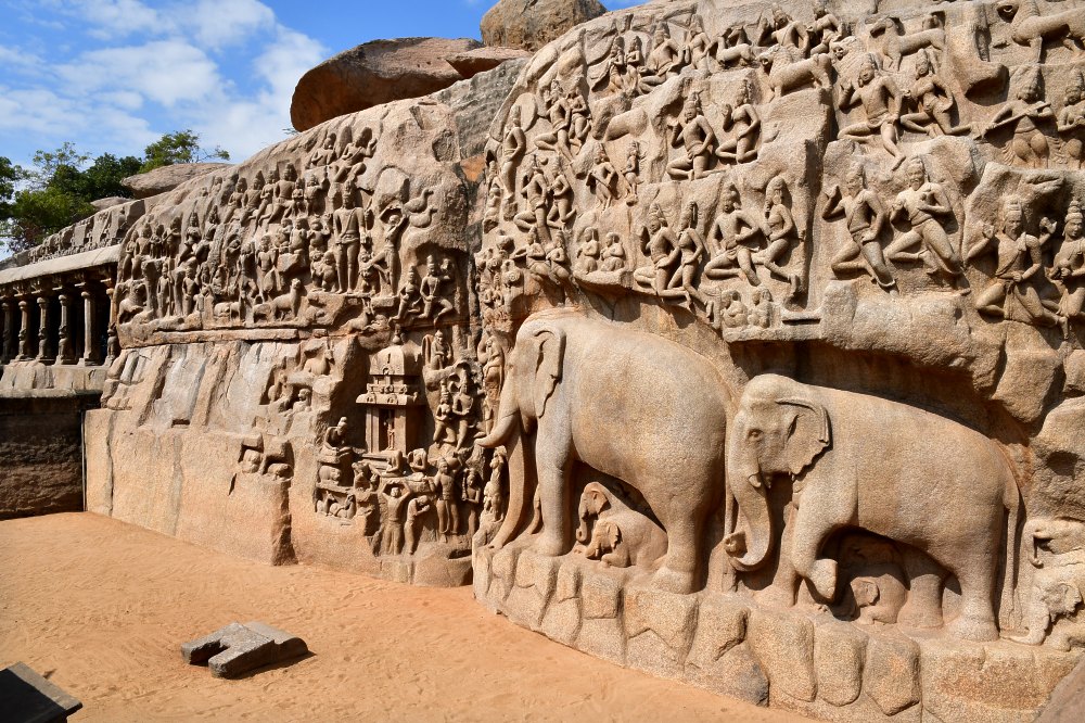 On aperçoit en haut de la fissure naturelle les restes maçonnés d'un ancien réservoir. Autrefois, de l'eau était déversée pour figurer la descente de Ganga sur la tête de Shiva.