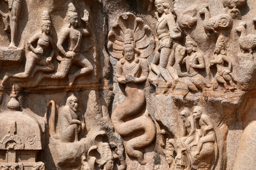 Sculpture représentant les serpents divins, moitié serpents moitié humains, dans le lit du Gange. Les Nagas sont symboles de prospérité.