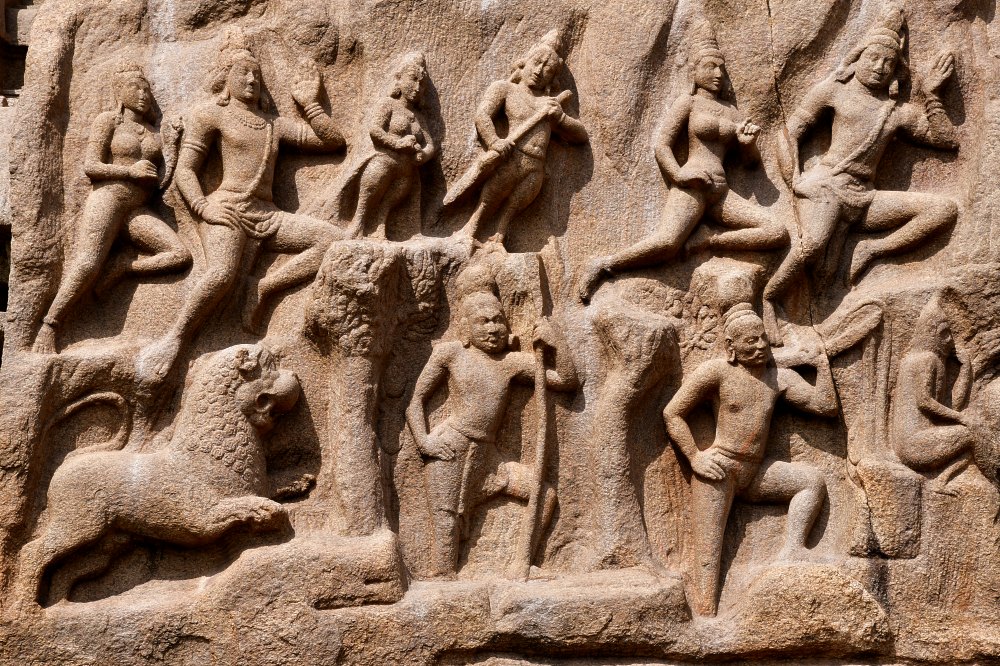 Détail des chasseurs sur le panneau de droite. L'un a un arc, d'autres sont dans la forêt. Le lion est prêt à attaquer.