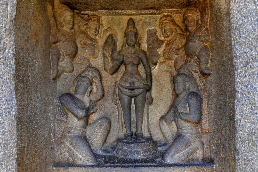 Durga est sculptée sur le mur extérieur du Draupadi Ratha. A ses pieds des fidèles dont l'un, celui de gauche, est prêt à se couper la tête pour elle.