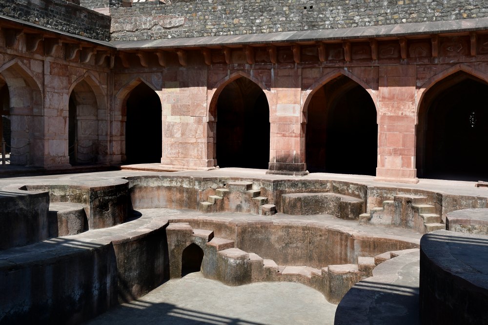 La piscine située au nord de Jahaz Mahal est entourée de colonnades de trois côtés.
