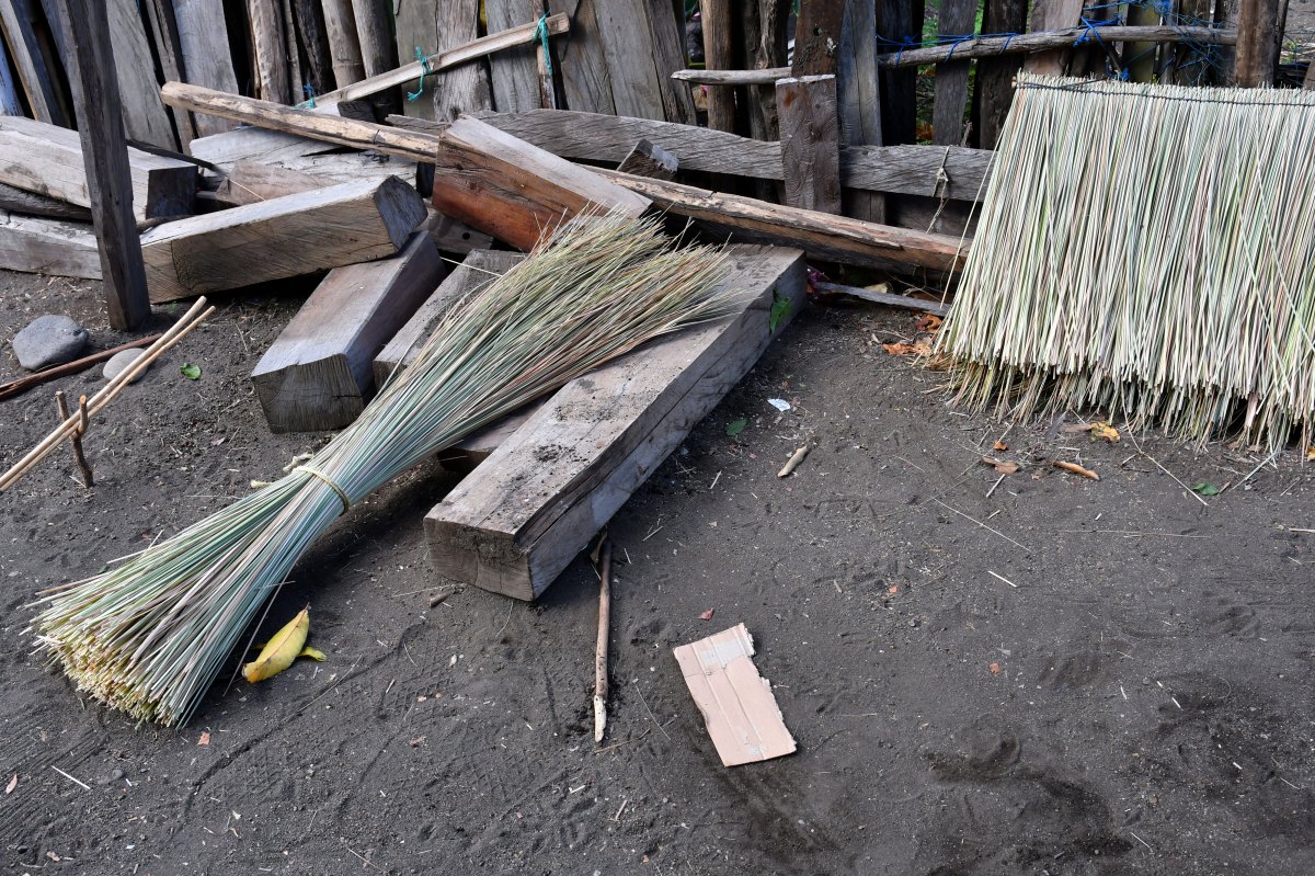 Préparation des roseaux qui recouvriront les toits.