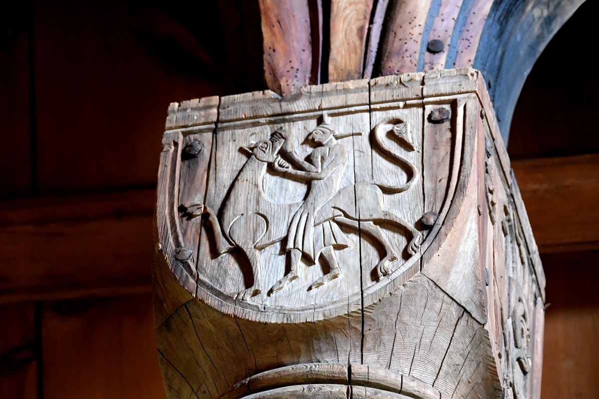 Les chapiteaux des colonnes sont sculptés de dragons, de centaures et de formes humaines.